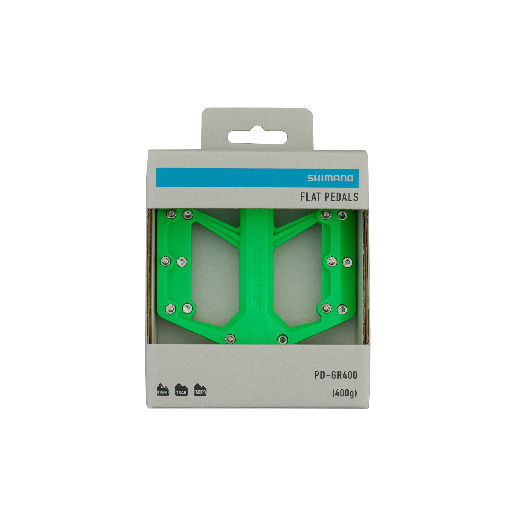 Measuring a healthy 101 x 96 mm and built with a grippy contact surface area optimized for trail riding, Shimano’s GR-400 pedals provide a stable platform that’s secure underfoot. Confidence is further enhanced by nine removable pins per side, which assist in delivering the ideal balance of grip and mobility. The end result is a pedal that keeps your foot secure and engaged, but also allows you to reposition on the fly or stick a foot out if things get a little too rowdy.
